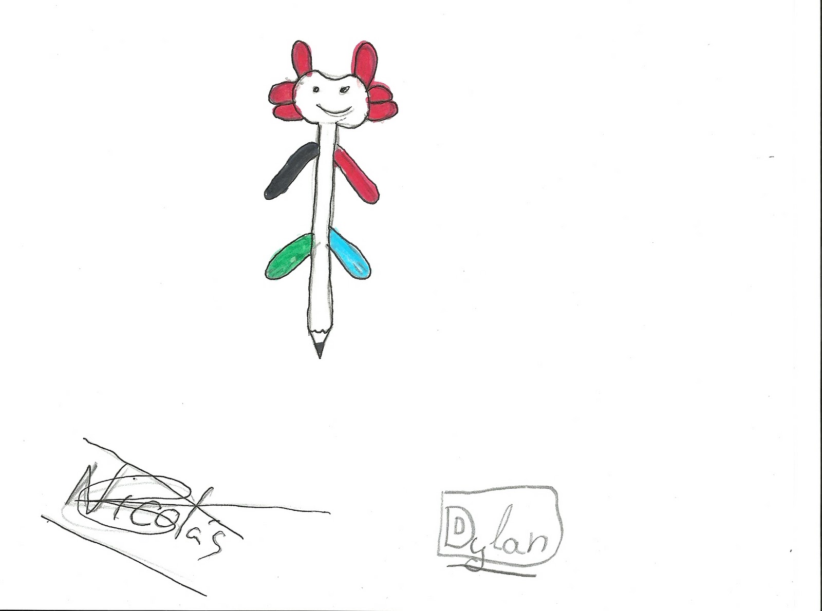 Es un lápiz normal cubierto de color blanco por los lados con sus patitas que cambian de color cuando las bajas. Tiene los siguientes colores: rojo, arriba a la derecha; Negro, arriba a la izquierda; Azul, abajo a la derecha; Verde, abajo a la izquierda.Tien una cabeza de ajolote para que sea entero. Está hecho de madera y sirve para las oficinas y escuelas.